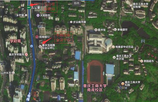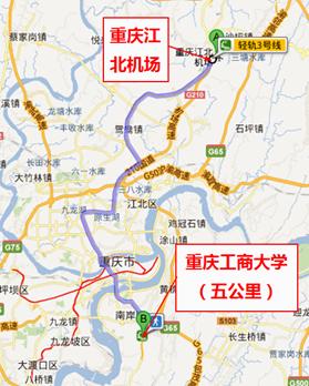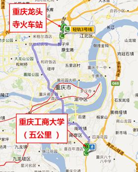 您可以选择乘坐飞机或火车抵达重庆。无论是飞机或火车,都可以直接乘坐重庆轻轨三号线到五公里(重庆工商大学)站下车就到(图1)。附近有学豪酒店、华商国际会议中心、拉斐皇廷酒店、喜百年酒店、洛可快捷酒店等。