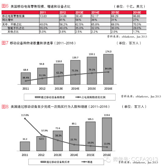据eMarketer报告,测算美国2013年移动电商零售规模达到384亿元,同比增长56%,远高于电商整体增速。