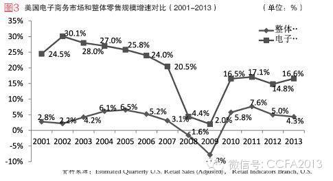 2013年美国电子商务市场增速16.6%,近几年增速已趋于平稳,同期整体零售市场规模增速为4.3%。对比美国电子商务市场增速和整体零售规模增速,电子商务增速近4年年均16%左右,同期整体零售市场增速年均5%左右。(见图3)