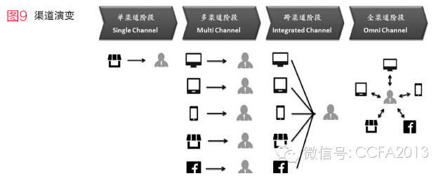 2013年超过60%的美国零售商将“全渠道”作为其重要性排名第一的公司战略。渠道变革的四个中,最终的全渠道阶段是以消费者为核心,消费者自然地在各种现实和虚拟的购物环境之间转换,且这种转换越来越是无意识地,渠道之间的界限越来越模糊。(见图9)
