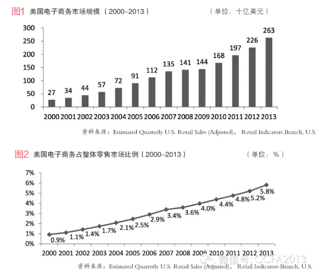 相关统计显示,2014年,中国电子商务市场规模超过美国。行业普遍认为,美国线下零售企业的整合度和集中度较高,供应链效率更强,电商企业在供应链上的价格和效率的优势不明显,所以造成规模相对落后于中国。