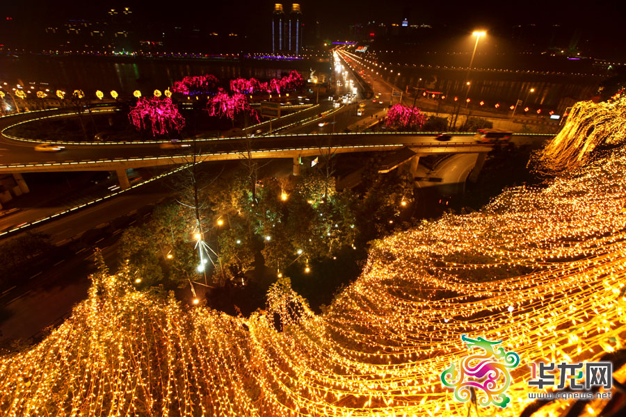 渝中区石板坡立交桥的灯饰直流而下,形成瀑布。 记者 李文科 摄