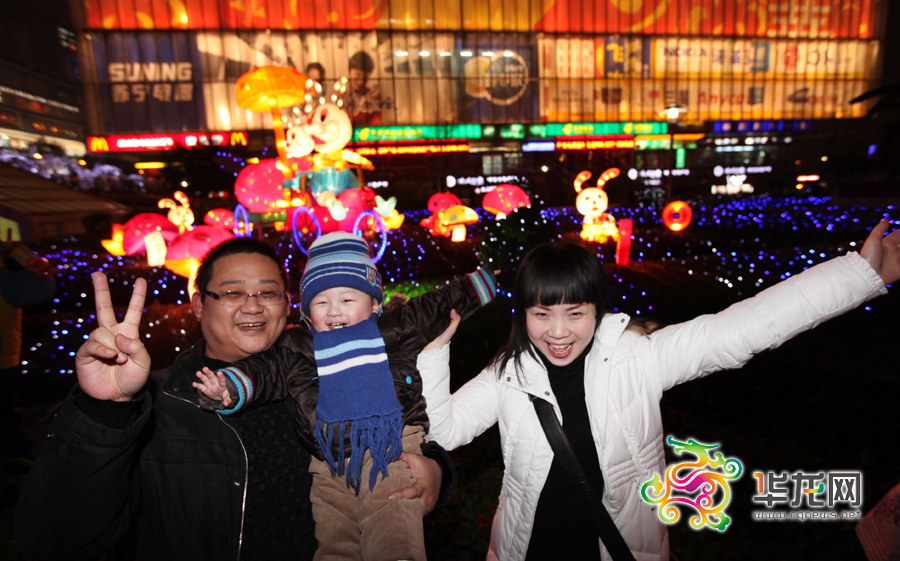 新年到,迎玉兔,在玉兔灯饰前来一张全家福。 记者 李文科 摄