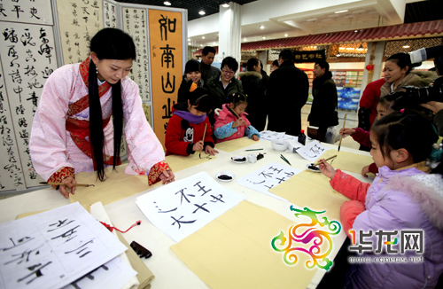 宽敞的重庆市书刊交易市场内部,一群孩子在现场学书法。 记者 李文科 摄