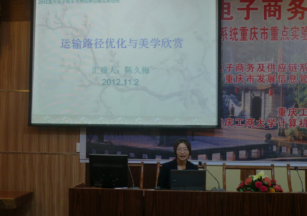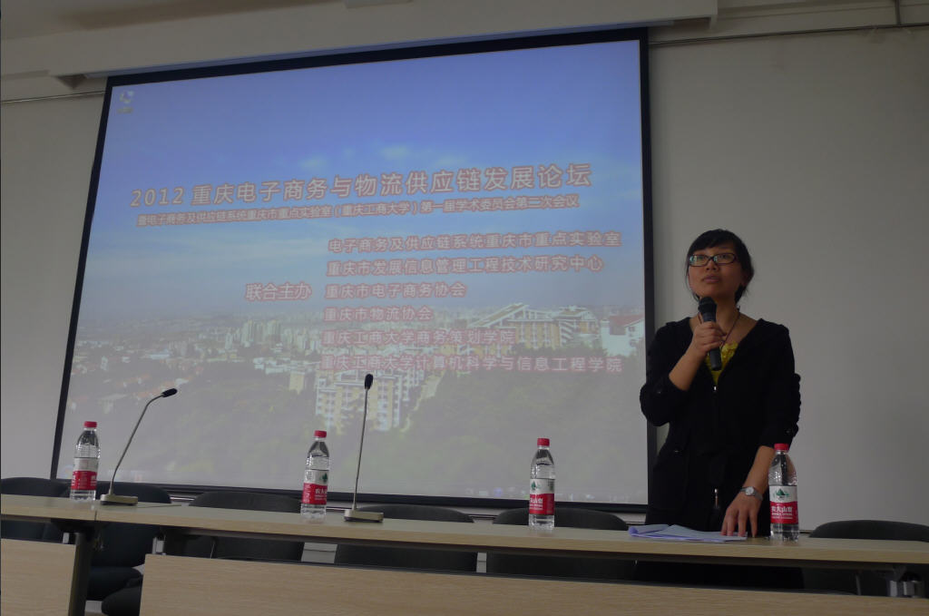 下午上半段论坛报告,由重庆工商大学计算机科学与信息工程学院曹晓莉副教授主持。重庆工商大学龚英教授、重庆易易商电子商务有限公司创始人吴限首席执行官、重庆工商大学唐灿博士分别就低碳经济下的绿色供应链构建、电子商务环境下的物流新趋势、基于个性化的智能搜索在电子商务中的应用作了主题报告。
