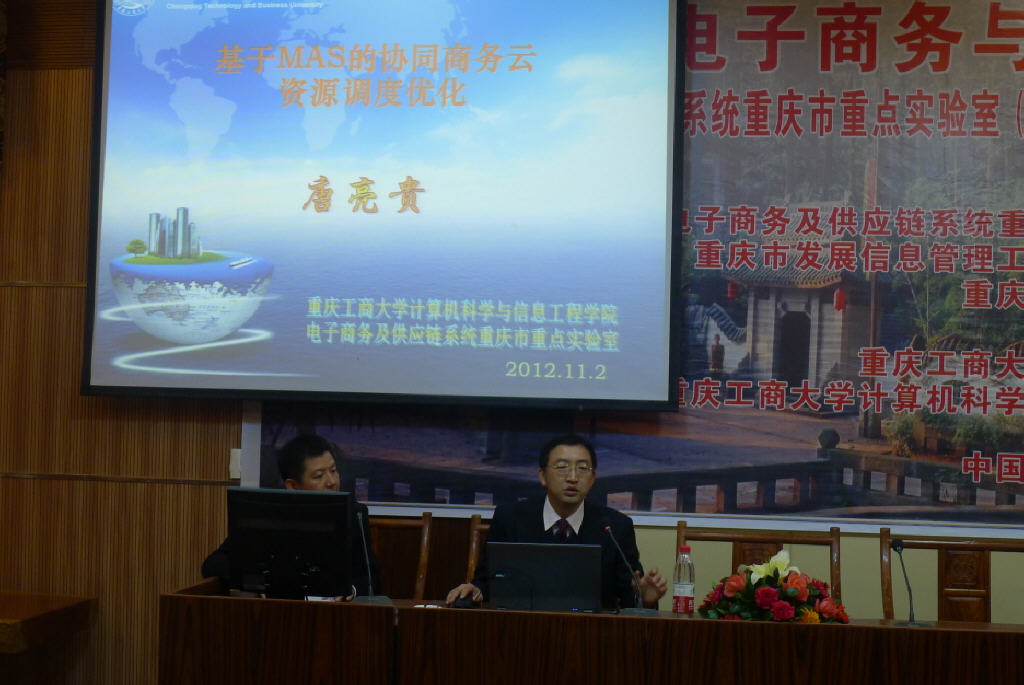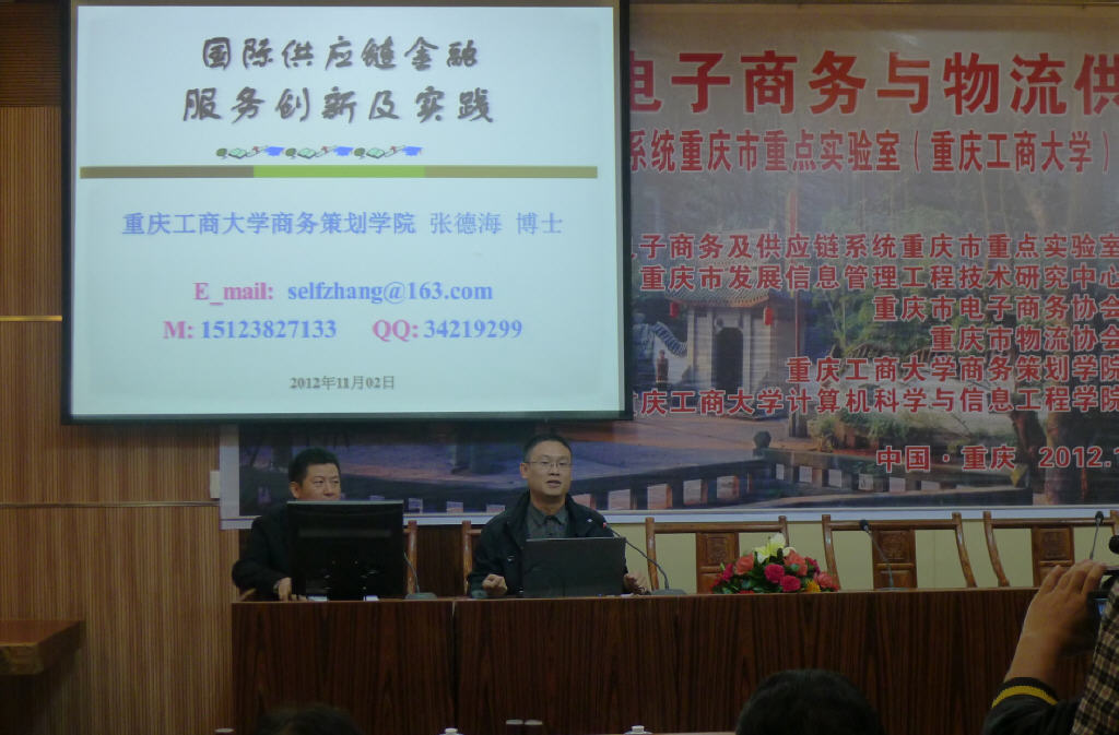 2012重庆电子商务与物流供应链发展论坛分三段进行。重庆工商大学商务策划学院詹川副教授主持了上午的论坛报告。重庆工商大学唐亮贵博士、久梅博士、张德海博士分别就基于MAS的协同商务云资源调度优化、运输路径优化与美学欣赏、国际供应链金融服务创新及实践作了主题报告。