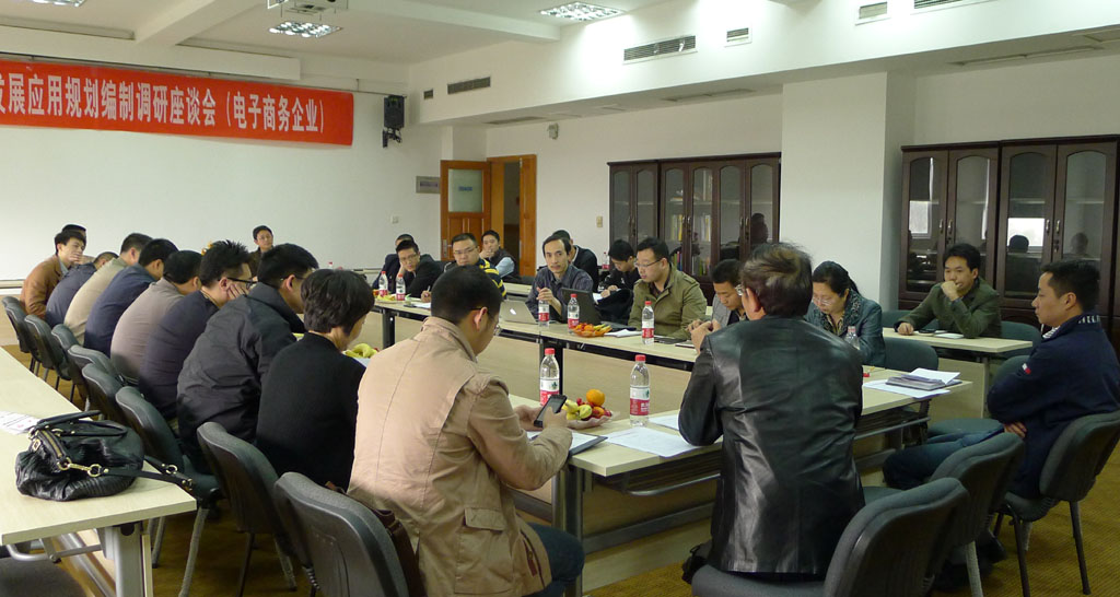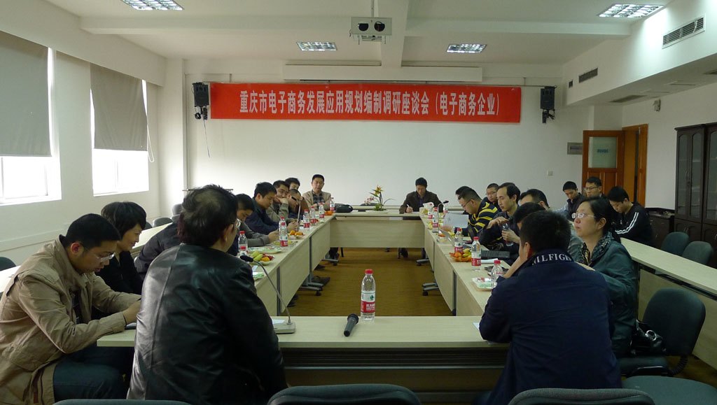 2013年3月14日下午2:30,重庆市电子商务发展应用规划编制调研座谈会于启智楼406多媒体会议室顺利举行。本次座谈会参会者包括重庆市电子商务协会会长姚章、重庆市商委王处长、电子商务及供应链系统重庆市重点实验室副主任黄辉、猪八戒网创始人刘川郁、每日鲜负责人等8个重庆知名电商企业代表。