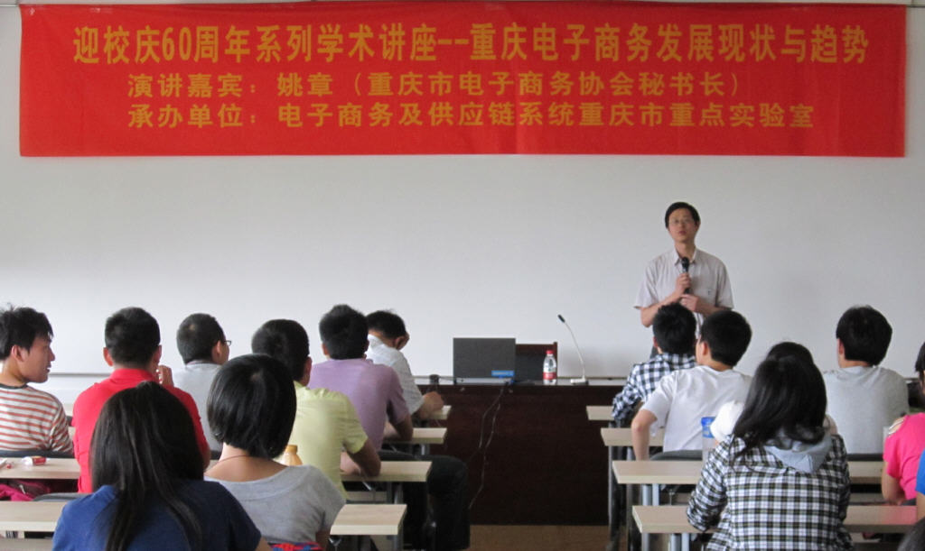 4月27日,为迎接重庆工商大学六十周年校庆,电子商务及供应链系统重点实验室邀请了重庆市电子商务协会秘书长、重庆网站联盟理事长、中国电子商务协会专家姚章先生为实验室师生做了题为“重庆电子商务发展现实与未来”的专题报告。报告会由重点实验室常务副主任黄辉教授主持。实验室研究员梁新元教授、陈久梅副教授、沈红兵博士,以及电子商务专业学生50余人出席了报告会。