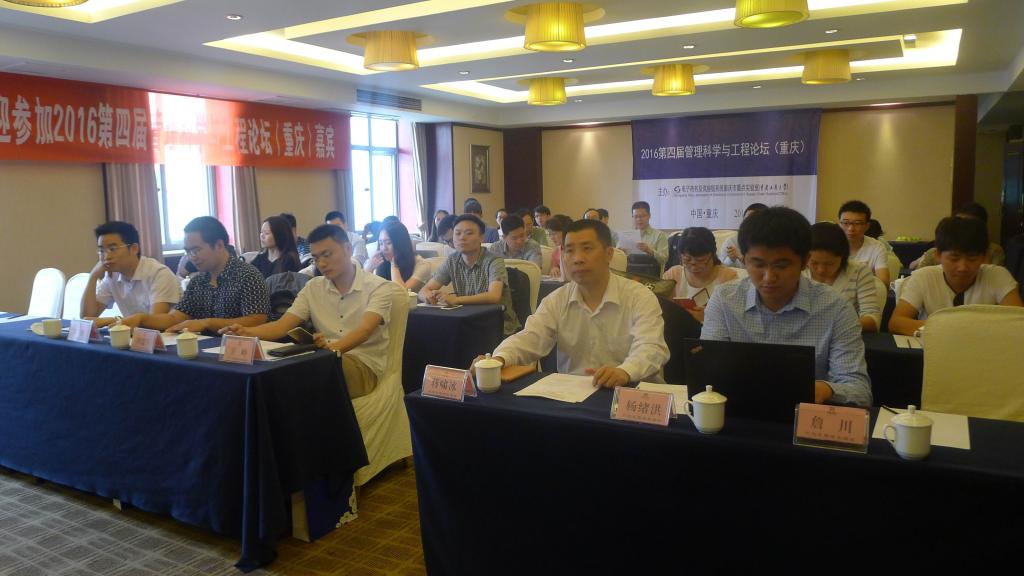 2016年5月21日,由电子商务及供应链系统重庆市重点实验室举办的“2016第四届管理科学与工程论坛(重庆)”在重庆工商大学学豪酒店17楼2会议室成功举行。本次论坛的主讲人分别是:来自西安电子科技大学的刘爱军,西南交通大学机械工程学院郭鹏博士,重庆精驿行供应链管理有限公司高级经济师蒋啸冰,金山软件西山居软件构架师卫峥,西南交通大学机械工程学院博士生杨绪洪,重庆工商大学詹川副教授。此次论坛有各高校的学术界人士和企业界人士参加。