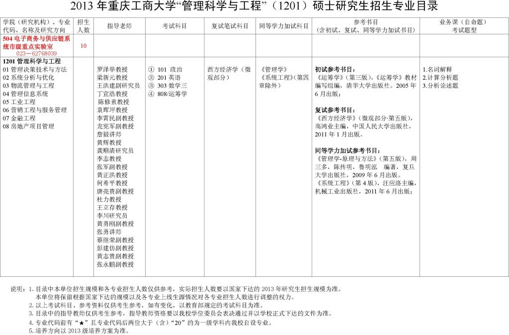 2013年重庆工商大学“管理科学与工程”(1201)硕士研究生招生专业目录
